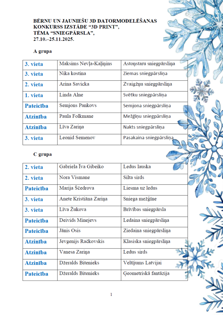 No 3. novembra līdz 25. novembrim, Rīgas bērnu un jauniešu centrā “Auseklis”, varēja apskatīt bērnu un jauniešu radītās 3D sniegpārsliņas – īstus mazos mākslas un tehnoloģijas brīnumus!