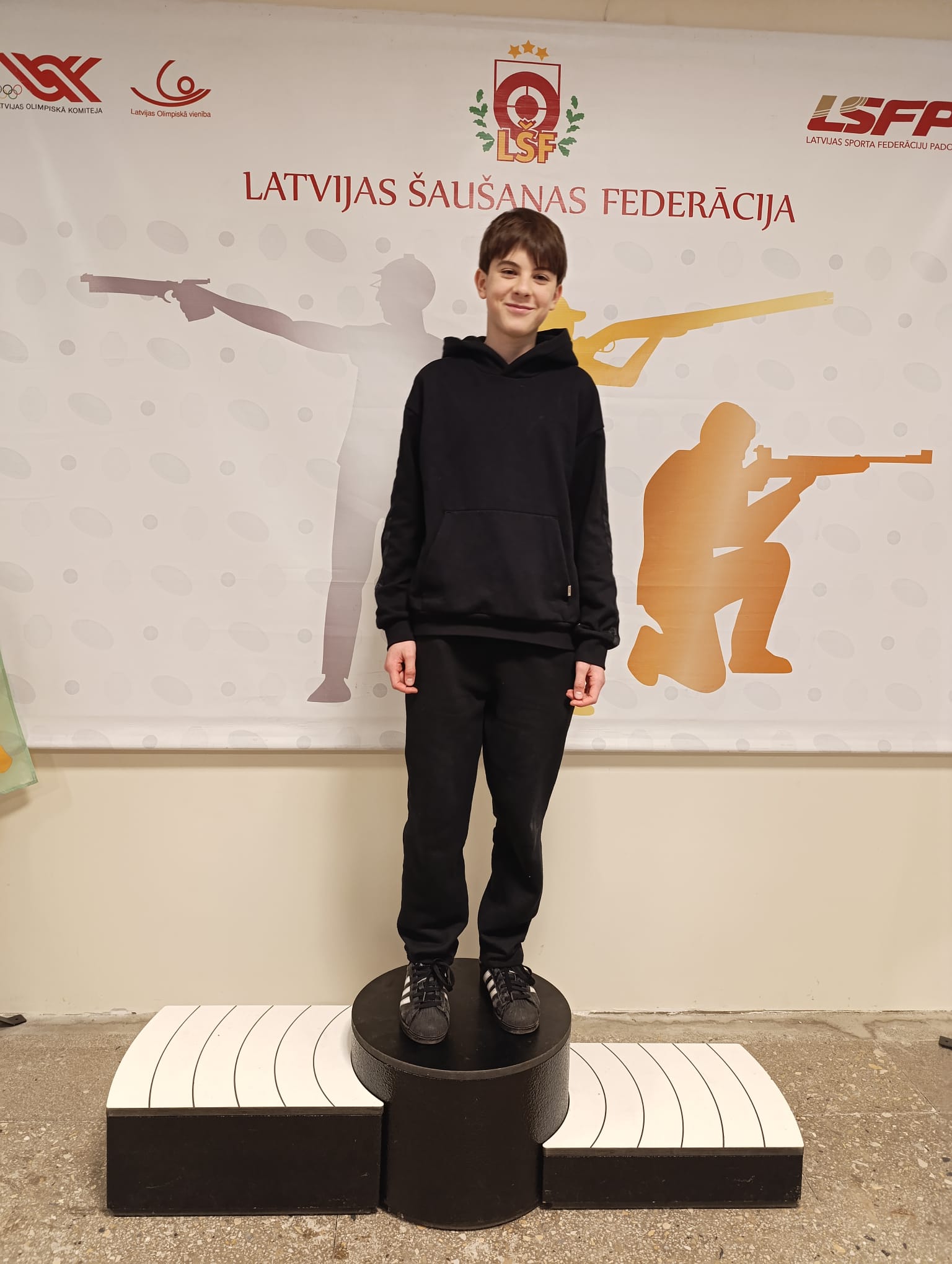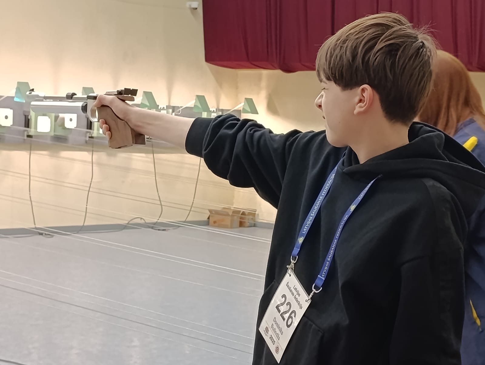 Dominiks Bulindžs izrādījās labākais no visiem, iegūstot pirmo vietu šaušanā ar pneimatisko pistoli un kļūstot par Latvijas čempionu, uzstādot personīgo rekordu 268 p. un sasniedzot 2. sporta klases normatīvu. Timuram Baranovskim arī ir labs rezultāts – 245 punkti, 8. vieta, 3. sporta klase un personīgais rekords. Marks Kalvišs – 215 punkti, 26.vieta. Diviem audzēkņiem  šīs bija pirmās sacensības, un viņi guva labu pieredzi: Arīna Izinkeviča – 228 punkti, 11. vieta, Silvestrs Kovaļovs – 215 punkti un 25.vieta. Viņš arī izšāva no mazkalibra pistoles (159 punkti), ko viņam deva tēvs, kuram piederēja personīgais ierocis.